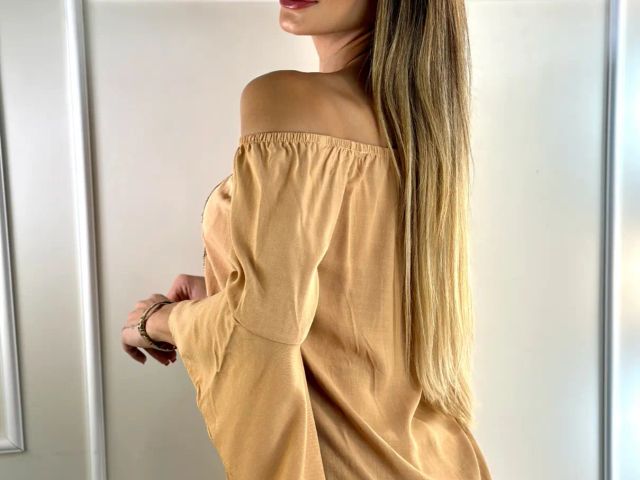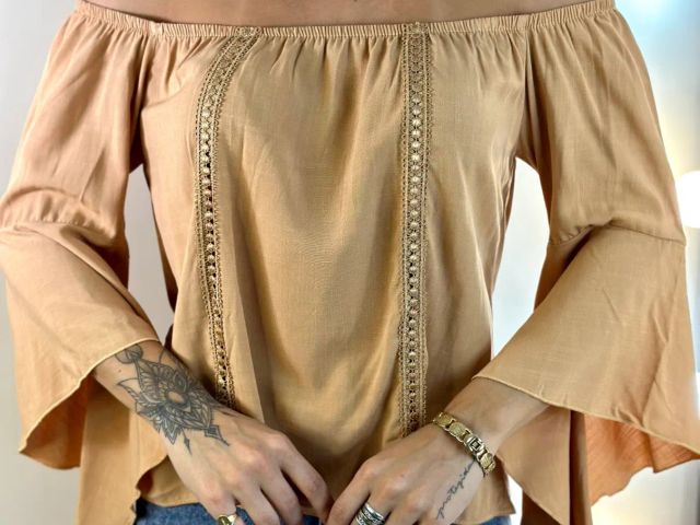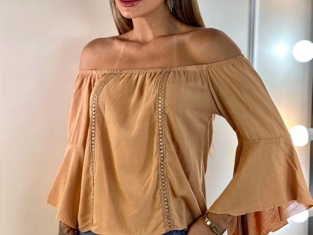 Blusinha Ombro a Ombro Manga Flare de Sino Anjo 3/4 Detalhe de Renda Elegante